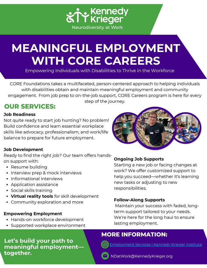 CORE Foundations takes a multifaceted, person-centered approach to helping individuals with disabilities obtain and maintain meaningful employment. These supports span across the job cycle and include everything from job searching and preparation to support for independent workers. Outlined below are several service offerings through our CORE Careers program.